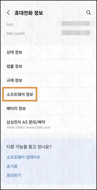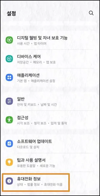 갤럭시 설정 메뉴로 다시 들어가신 후 가장 하단에 보이는 “휴대전화 정보” 메뉴로 진입해주세요.
