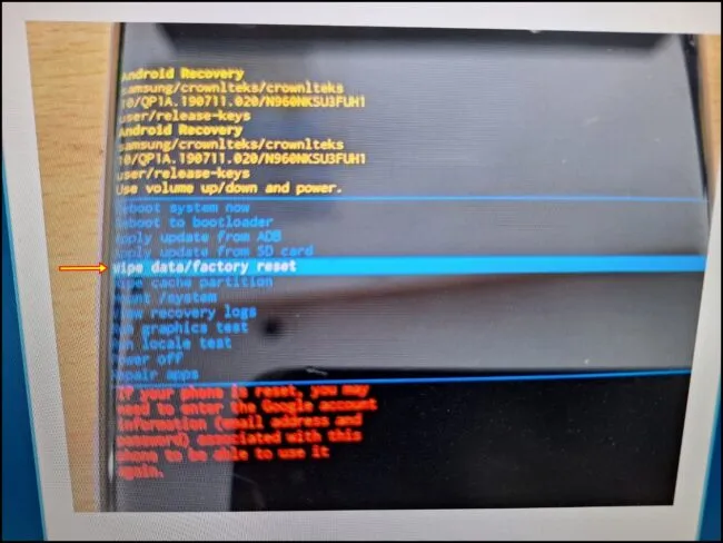 - 리커버리 모드가 실행되면 볼륨 버튼을 이용해 Wipe data/factory reset으로 이동한 후 전원 버튼을 눌러준다.