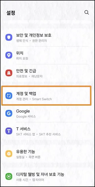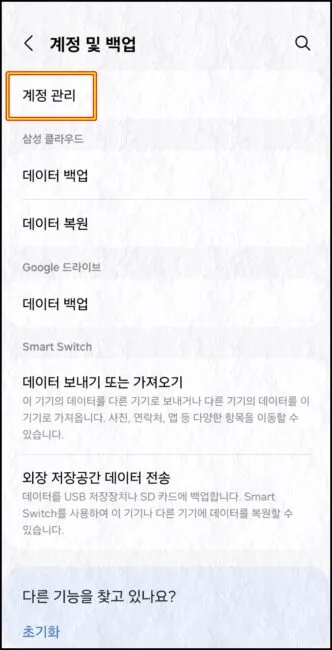 휴대폰에서 설정 > 계정 및 백업 메뉴로 진입 >> 계정관리 이동