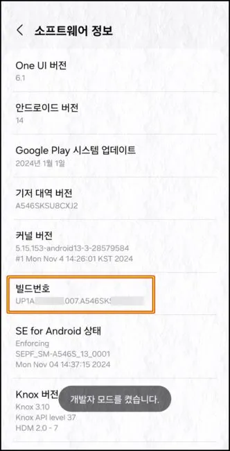 “빌드번호” 라는 항목을 개발자모드가 켜질때 까지 연속해서 터치해주세요.