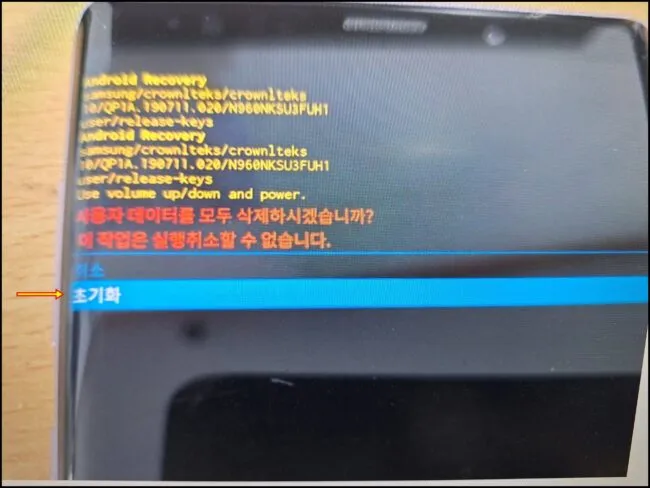 - 초기와 또는 YES 항목을 볼륨버튼과 전원버튼을 이용해 실행해 준다